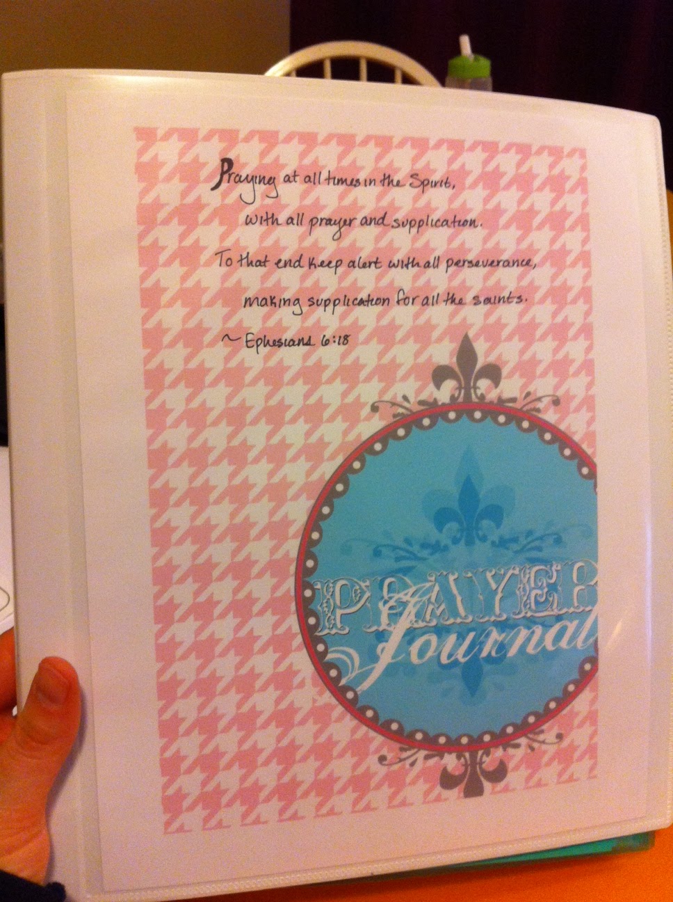 - Cover: Printed from Cut and Create. The picture seems to be broken on this post, but there is a link for Prayer Journal Cover right under it. I wrote Ephesians 6:18 on it as well.