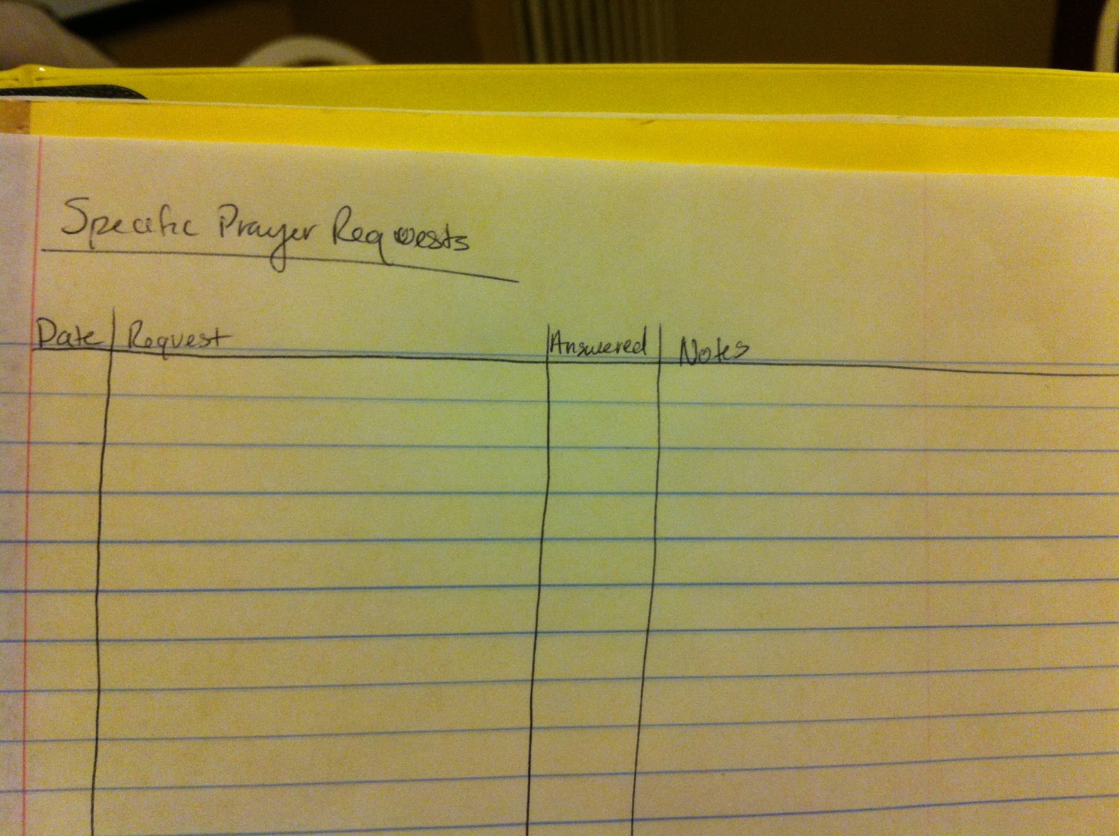 - Specific/Urgent (Daily): Every day, I’ll pray through specific requests. It may be urgent issues in my family, requests emailed to me in prayer chains or from friends or family, or things I simply want to pray for every day until I see an answer or feel released from praying for it any further. I drew a table onto lined paper to track the requests, including the date, the request, the date answered, and notes.