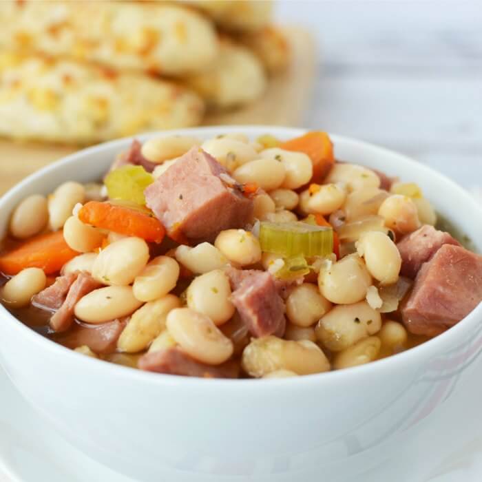 Ham and Beans from Eating on A Dime| Looking for that classic ham and bean soup, this is it. You have a mix of vegetables, white beans, and cubed ham with some seasonings.